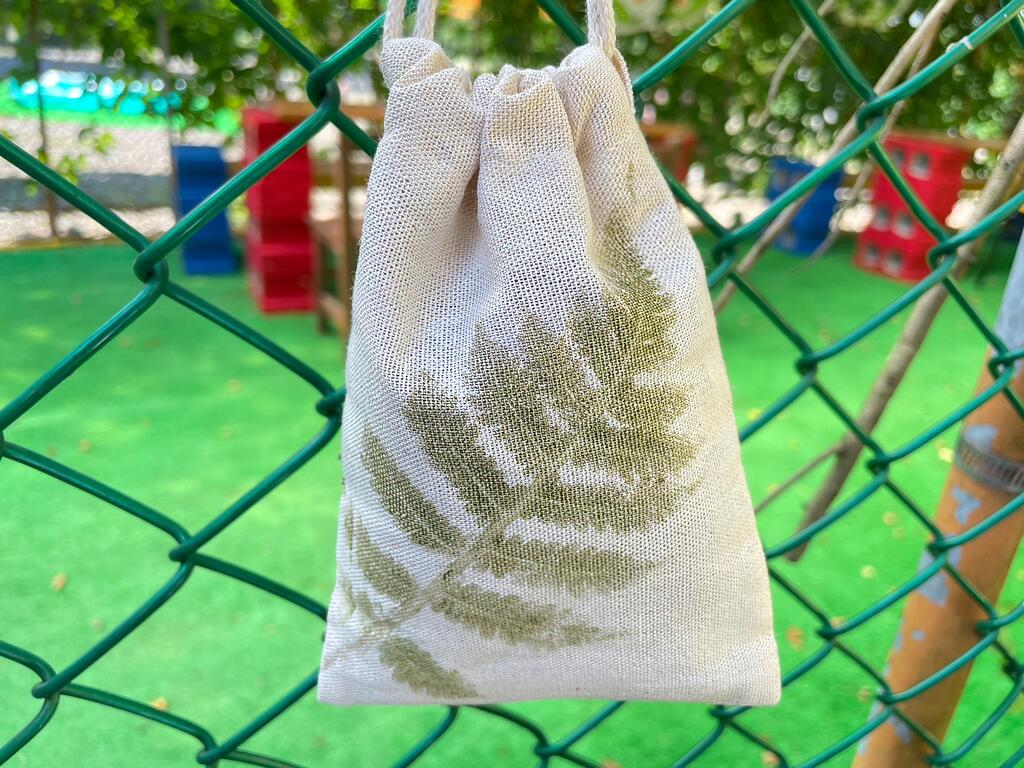 (3)構思拓染圖案,將植物擺放在束口布袋上,使用膠帶將植物固定住。