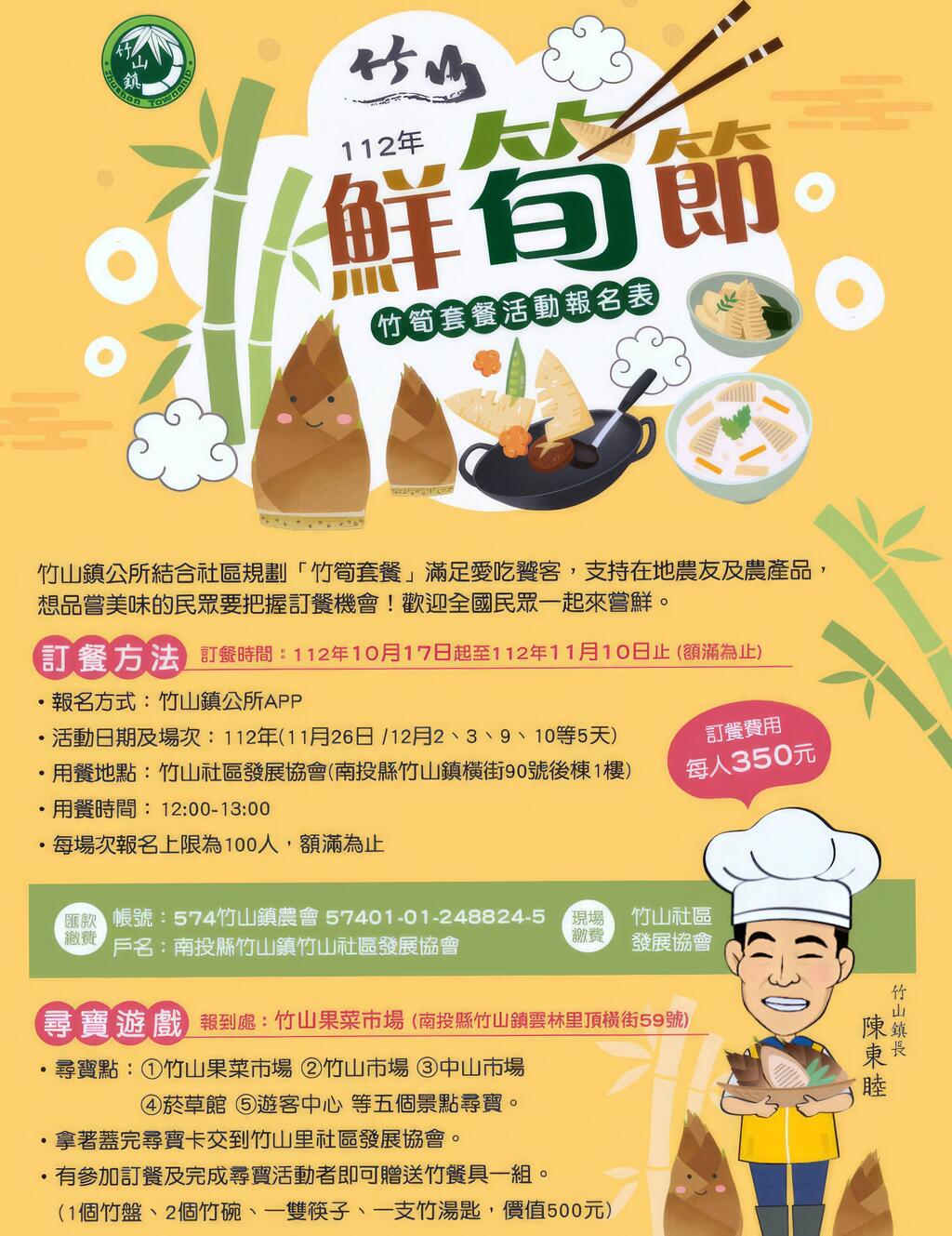竹山鎮公所結合社區規劃「竹筍套餐」,滿足愛吃筍饕客,支持在地農友及農產品,想品嘗美味的民眾要把握訂餐機會!歡迎全國民眾一起來嘗鮮。