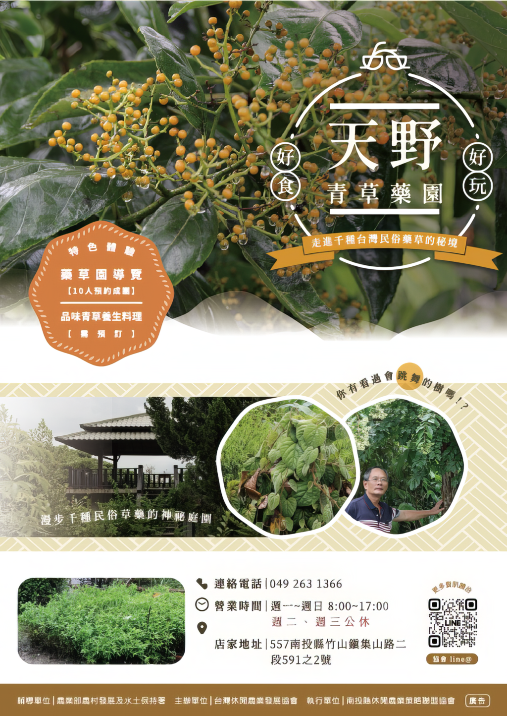 你知道南投有個地方種滿上千種台灣草藥嗎? 就在天野青草藥園休閒農場!,可預約團體導覽喔! 如果你逛到一半想嘗點草藥料理,餐廳就在隔壁! 讓你想到即吃到!
