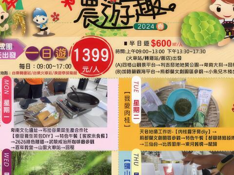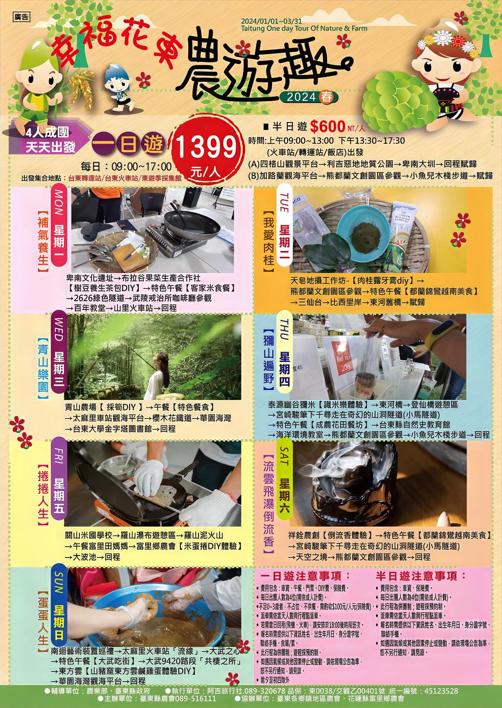 泰源幽谷獼米【識米樂體驗】→東河橋→登仙橋遊憩區→宮崎駿筆下千尋走在奇幻的山洞隧道(小馬隧道)→特色午餐【成農花田餐坊】→台東縣自然史教育館→海洋環境教室→熊都蘭文創園區參觀→小魚兒木棧步道→回程