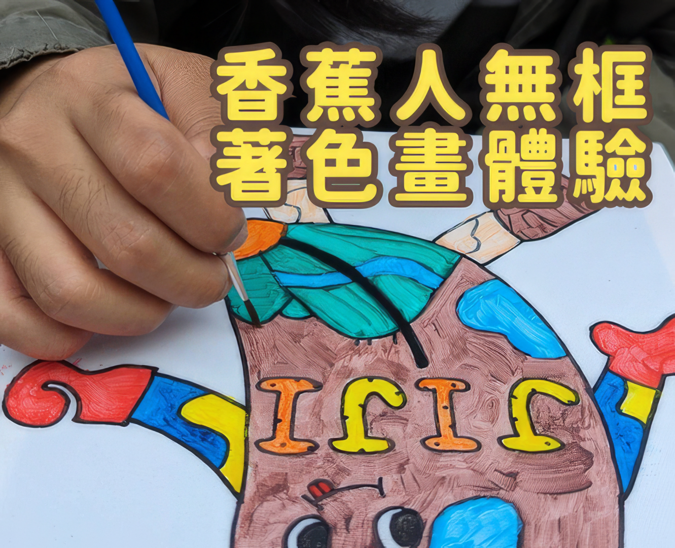 讓大小朋友們在香蕉園中席草地而坐,拿著畫筆、用五顏六色的顏料