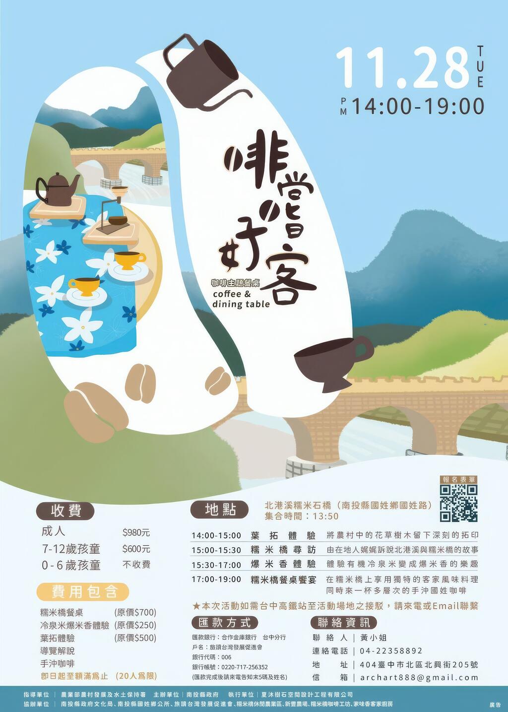 國姓鄉是南投縣最大的客家聚落,客家風味飲食自然也是這裡強烈的特色,本次活動將邀請家味香客家廚房的主廚親自操刀設計套餐式的菜單,讓來的饕客都能品嚐道地的客家料理,再來上一杯糯米橋工坊所製的在地特產—國姓咖啡,絕對是一場恰到好處的餐桌饗宴。