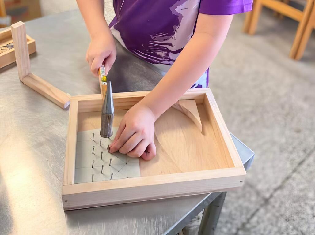 學習安全操作鐵槌敲敲打打,將一片片的木材組裝成專屬自己的手撥彈珠檯