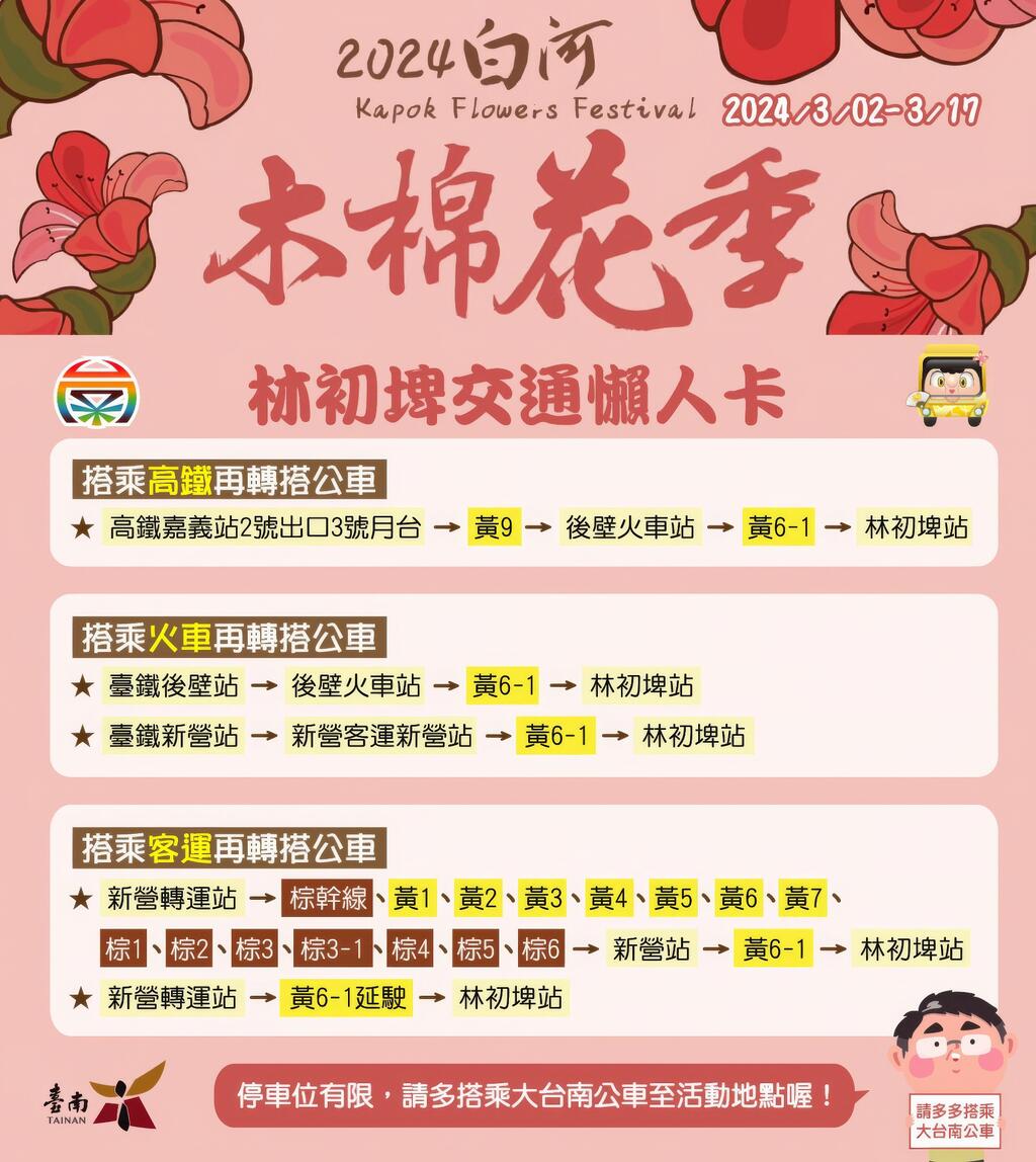 2. 更多活動交通資訊請看台南市政府交通局「運轉台南好交通FB」。