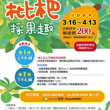 3月21日各專業農友大顯身手良性競爭,展示鮮美碩大特級枇杷的「枇杷評鑑會」。3月23日「枇杷產業文化活動」購買枇杷滿500元贈手作枇杷造型磁鐵,欣賞農會家政班成果展示,暢遊枇杷暨農特產美食展售園遊會。還有3月16日至4月13日「農遊太平」活動,今年特別推動食農教育,與太平在地小學合辦,讓學童到枇杷園區聆聽農民導覽枇杷栽種生產方式,還可報名參加採果趣活動,品嚐枇杷和藍莓鮮果、枇杷酵素,參與枇杷生態導覽及栽培管理作業,帶您走入枇杷達人的世界。