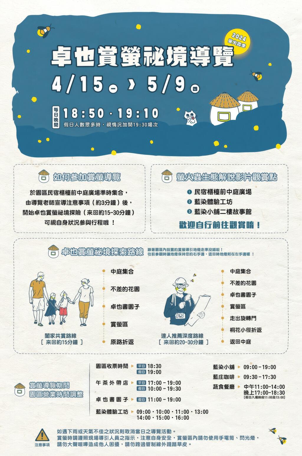 ✸於園區中庭廣場(藍染小舖前)#準時集合,由導覽老師宣導注意事項(約3分鐘)後,開始卓也賞螢祕境探險(來回約15-30分鐘),可視自身狀況參與行程