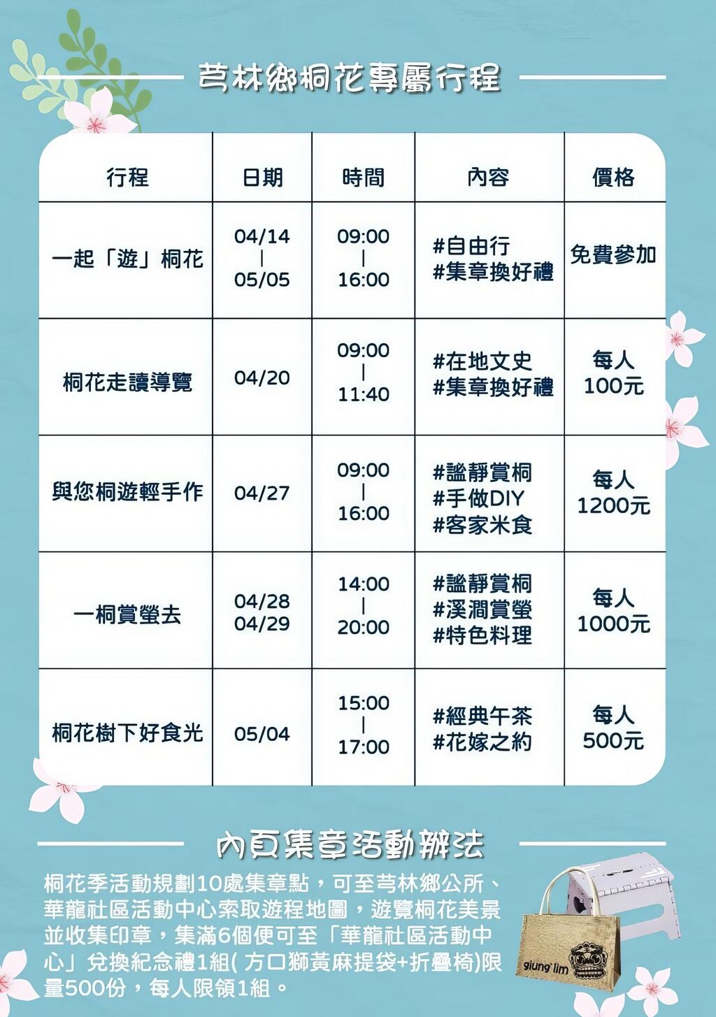 🌸 芎林鄉【#芎林清澗賞桐趣】一起遊桐花🌸 4/14活動開跑!「芎林鄉公所、華龍社區活動中心、紙寮窩、橘子碰、黃家伙房」索取遊程地圖,並在活動期間完成 6 個以上集章,就可以到華龍社區活動中心兌換紀念品1組 (方口獅黃麻提袋+折疊椅) 限量500份,每人限領1組。