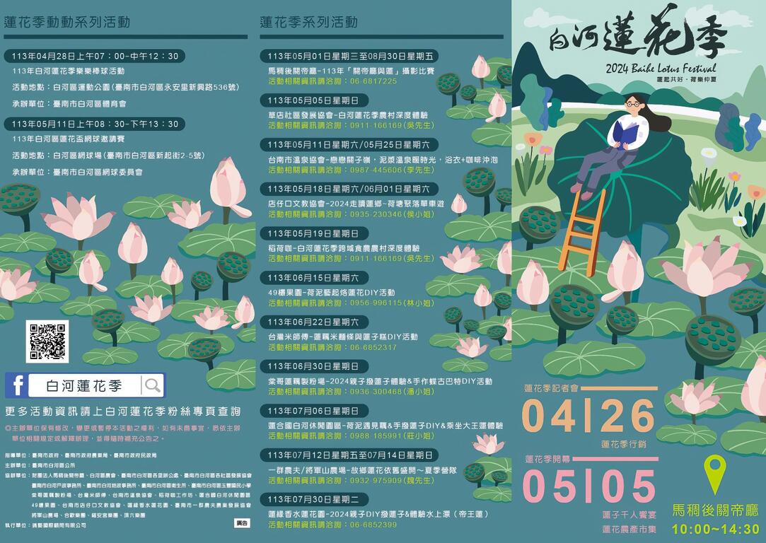 2024白河蓮花季以「蓮泥共好、荷勒仲夏」為主題,結合在地蓮花、蓮子等特色食材,推出多元化活動,包括體育活動、攝影比賽、農村深度體驗等,歡迎大家報名參與,邀您一同深度體驗經典白河。歡迎致電各活動單位洽詢~