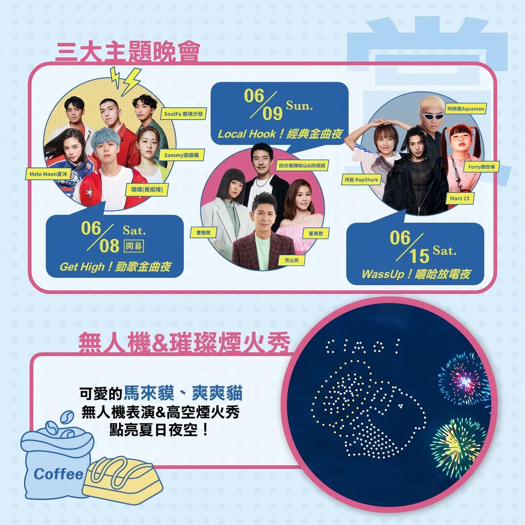 以投號玩咖為主題,有歌手演出、限定體驗、網美打卡裝置、咖啡主題活動、無人機煙火秀等,打造夏日樂園派對
