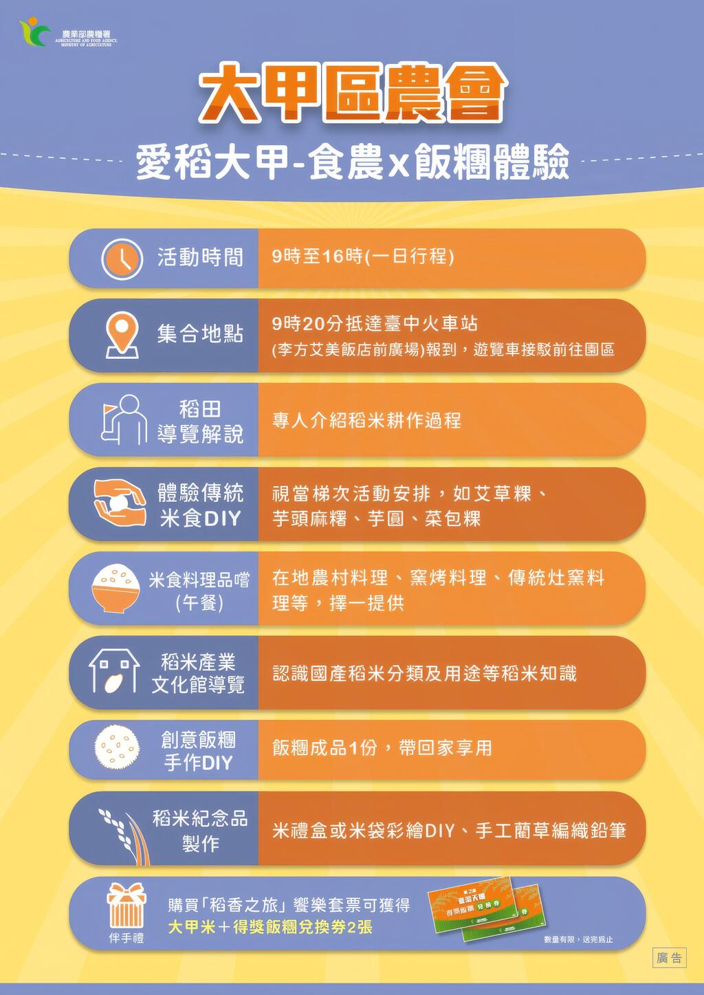 🌾活動地點:大甲稻田、匠師的故鄉休閒農業區、大甲稻米產業文化館、大甲農會食農講堂、大甲農會社區小舖