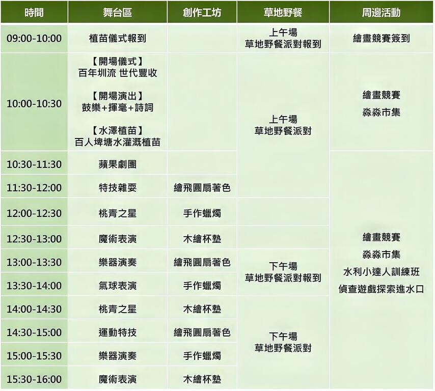 🌳水利小職人訓練班(現場報名) 🌳偵查桃園大圳進水口遊戲(現場報名) 🌳淼淼市集 🌳歡慶百周年抽獎