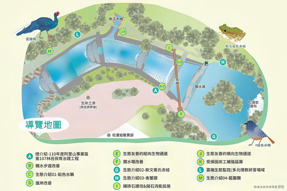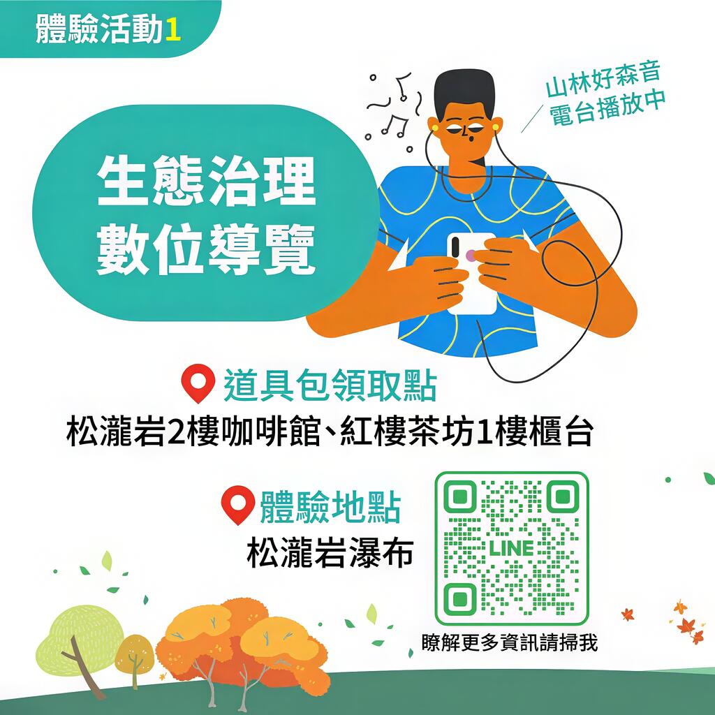 林業及自然保育署南投分署在國有林班地內導入數位創新應用,以南投縣竹山鎮阿里山事業區第107林班的保育治理工程為首場示範場域,包含在加走寮溪松瀧岩瀑布區戶外數位導覽「山林好森音電台專訪」,以及在杉林溪園區紅樓室內體感互動「山林好森音擬音師挑戰」,期望讓民眾的山林體驗更加深度多元。