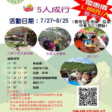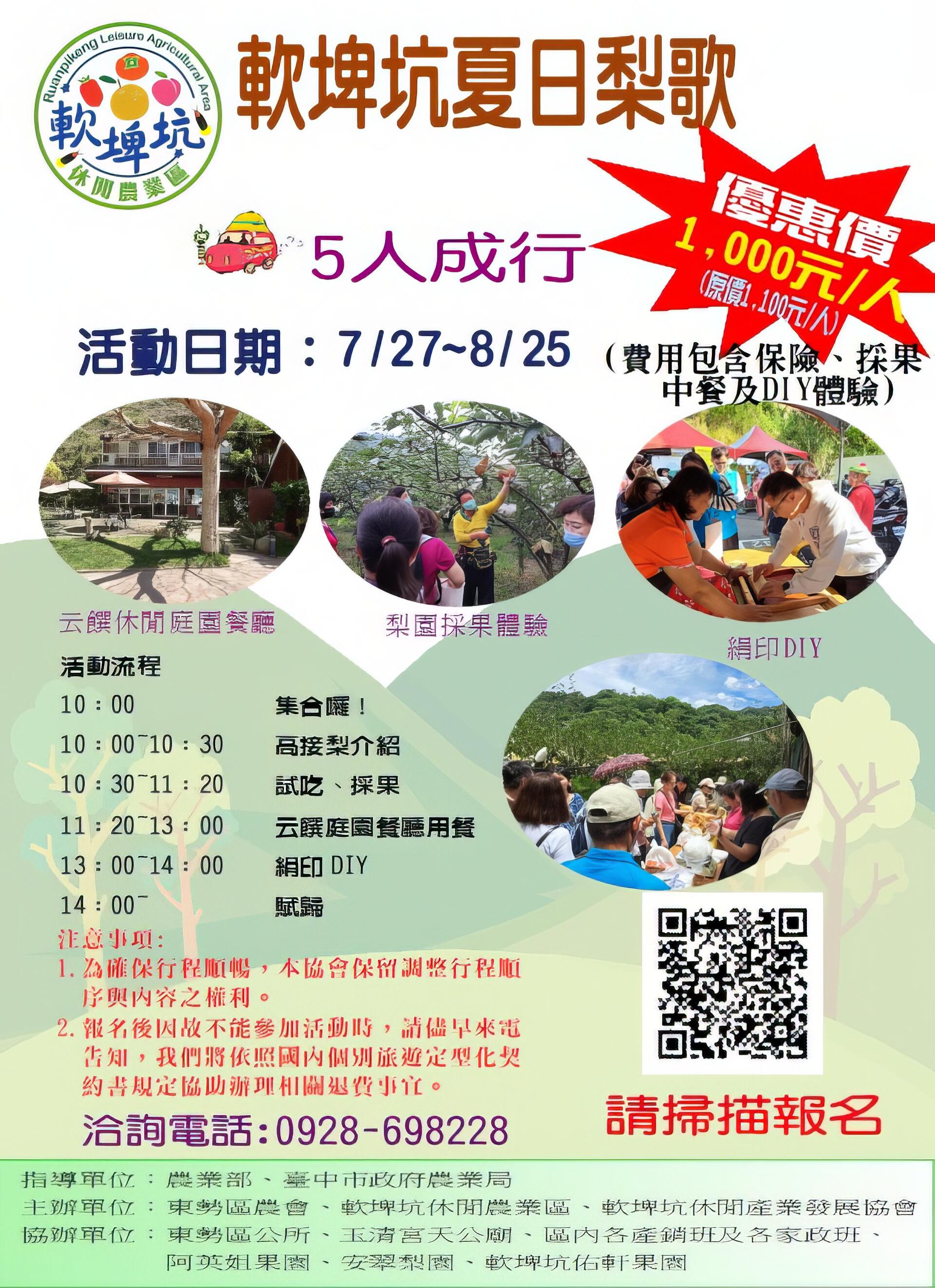 活動名稱:軟埤坑夏日梨歌(五人成行) 入園費用:$1,000/人,可帶走$200的梨子 活動時間:7/27-8/25 上午10:00-14:00 活動行程: 10:00-10:30導覽解說 10:30-11:20試吃水梨採果體驗 11:20-13:00云饌庭園餐廳用餐 13:00-14:00絹印DIY 14:00賦歸 活動地點:臺中市東勢區慶福街75號(軟埤坑遊客中心)