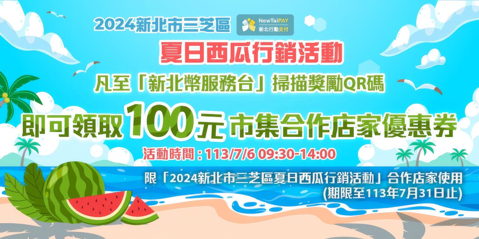 1.優惠券數量有限兌完為止,請留意【市政領獎】→【實體活動簽到】→【2024新北市三芝區夏日西瓜行銷活動】活動→優惠券剩餘數量。