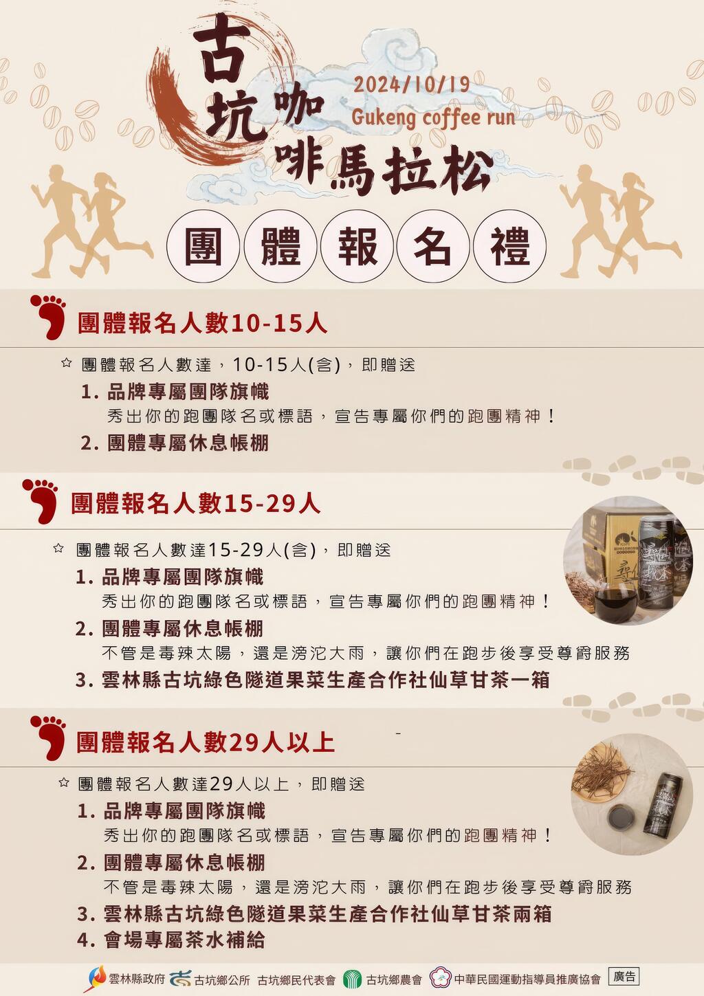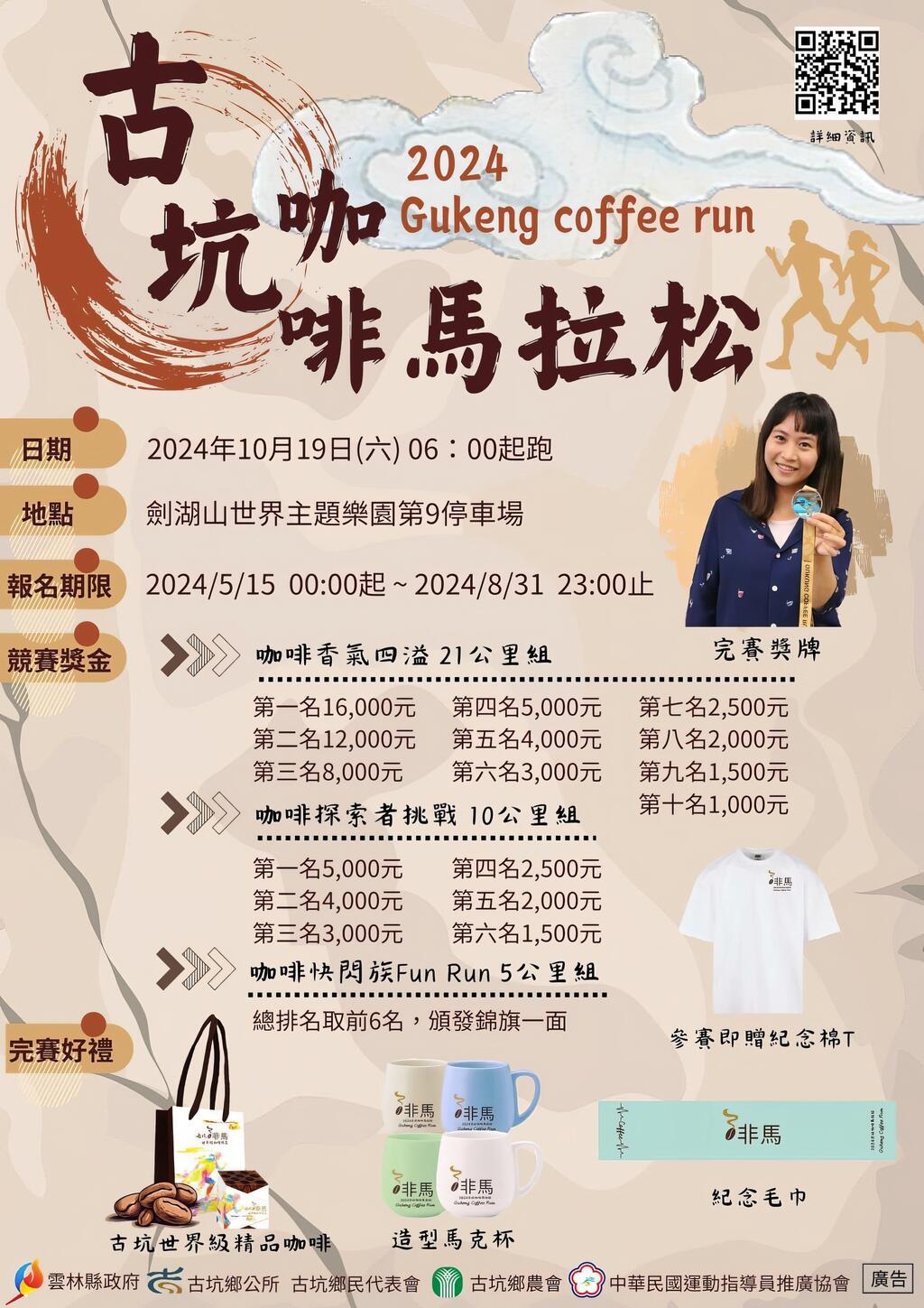 為推廣在地農產品及配合2024咖啡節活動,透過馬拉松活動提升古坑鄉觀光人潮,發揚古坑咖啡,讓參賽者(含老人、婦女及兒童少年)在競速過程中同時享受於古坑之好山好水。