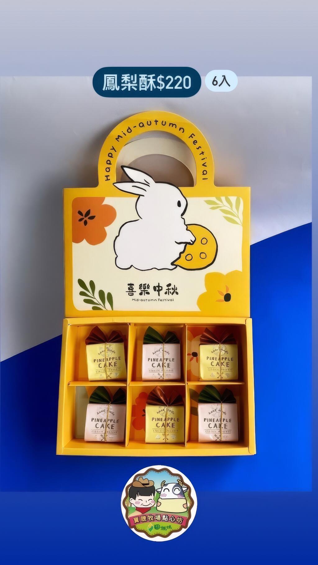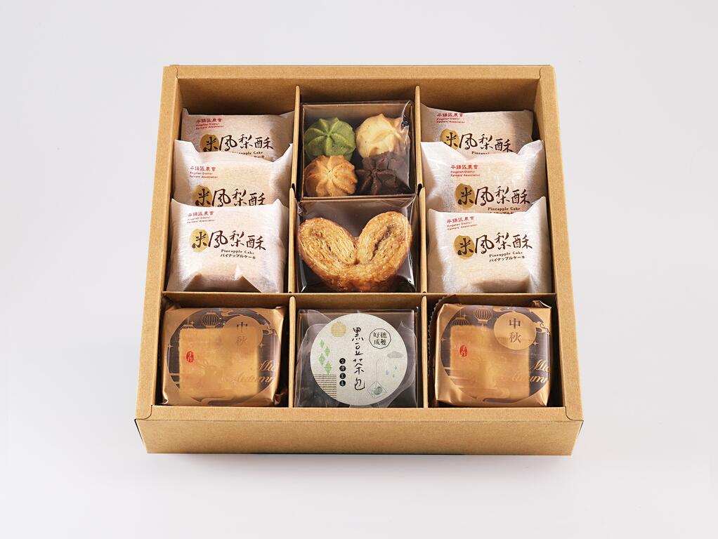 內含香草秈香米鳳梨酥*6、黑豆茶包*3、伯爵茶米鳳梨酥*2,千層蝴蝶酥*4、綜合曲奇餅乾*8