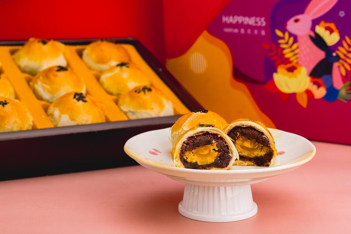蛋黃酥:香酥餅皮搭配鹹香整顆飽滿蛋黃,紅豆餡吃得到滿滿的顆粒感。