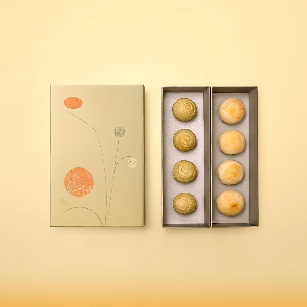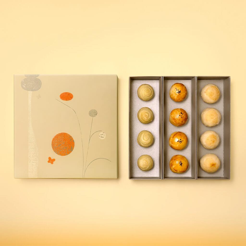 每盒內有三種口味,綠豆椪、蛋黃酥、芋頭麻糬酥,綠豆椪內餡以純綠豆沙製作,蛋黃酥內餡為甜而不膩的烏豆沙餡及整顆的鴨蛋黃,每款表皮都酥鬆有層次。