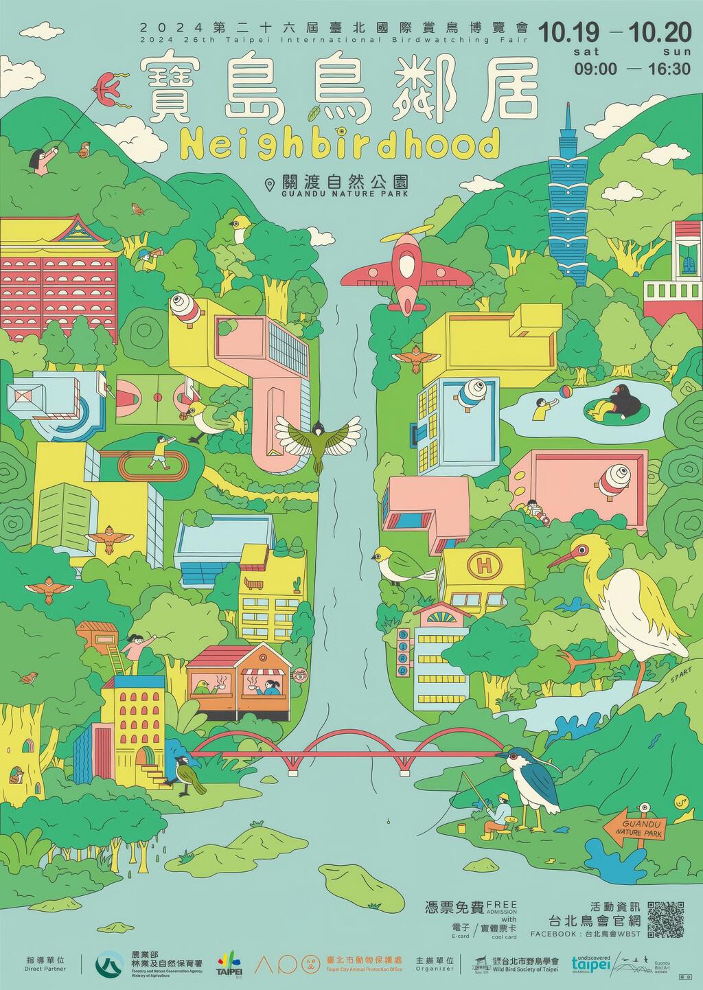 今年度邀請插畫藝術家57(本名吳騏)創作賞鳥博覽會主視覺。喜愛畫鳥的57也表達他的創作理念:「在都市化進程中,保存自然生態環境是一個重要課題。我們以寶島鳥鄰居為主題,將人鳥共生的概念融入其中,創作出結合自然與都市的視覺設計。這不僅是對綠化都市的期許,更是希望在現代城市中,人類與鳥類能共享和諧的生活空間。營造友善的鄰居關係,實現自然與城市的完美融合,讓識鳥、賞鳥、護鳥也能成為日常」。