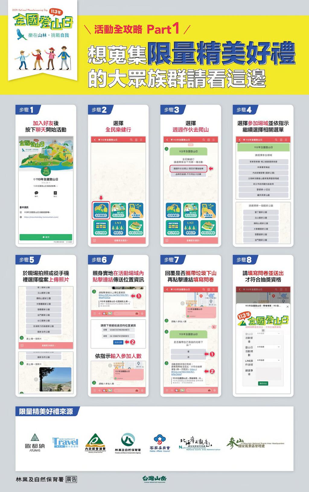 即日起至10/31,只要加入全國登山日的👉官方LINE群組,並在全臺各地的森林遊樂區、自然步道及山海圳國家綠道完成打卡,就有機會獲得多項好禮!