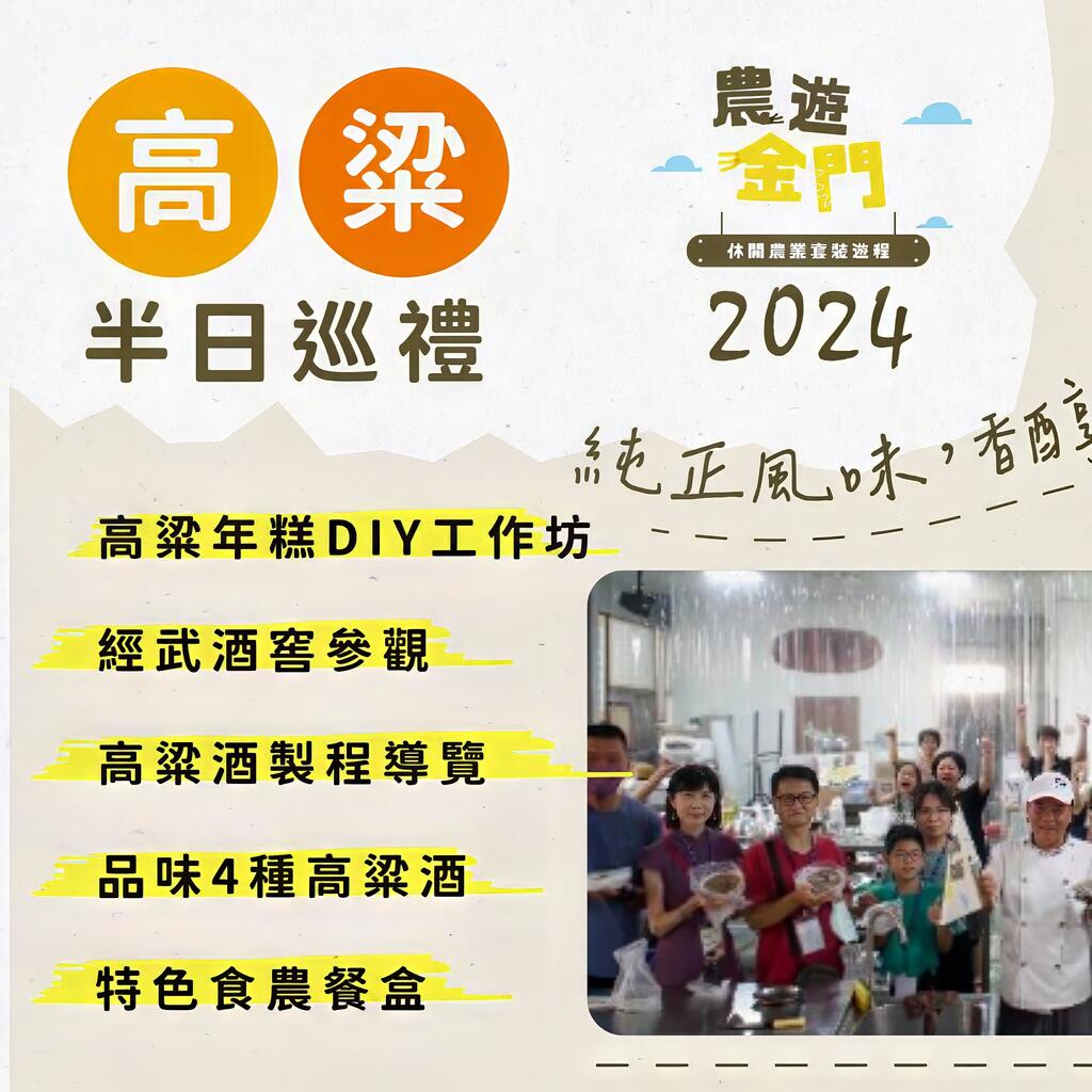 活動備有遊覽車接送,於9月8日分兩梯次進行,7:50於金湖山外車站集合、以及8:30於金門縣政府集合,每梯次各限額30名,活動首先會到凡可達食品工坊體驗高粱手作年糕,藉由手作體驗了解高梁之於金門產業的重要性,製作完成後則前往金武酒窖,由專業導覽人員介紹金門特色高粱酒品、高粱酒製成、高粱酒品嚐(未滿18歲不可飲酒),全程約需3-4小時,活動有深度且豐富精彩。遊程結束後,報名參與者還可以獲得食農餐盒,可以説有吃、有拿、更有滿滿體驗感。