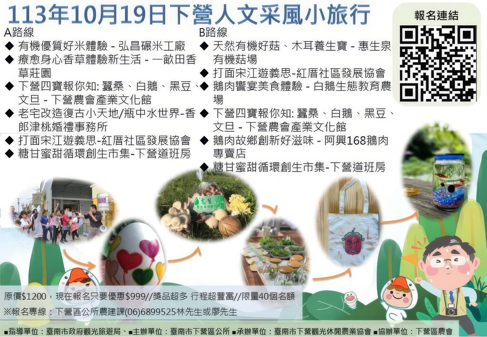 🚌2024下營人文采風小旅行🚌 ★活動日期:113年10月19日(星期六) ★活動時間:上午8:00 - 下午17:00 ★集合地點:下營農會超市旁停車場(台南市下營區中山路一段133號) ★活動費用:999元