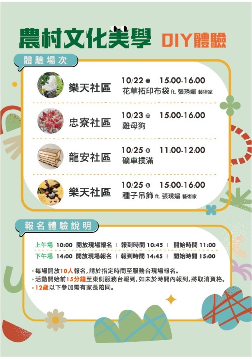 本次展覽集結新北農村再生社區的特色,以花草美學、地景美學、物產美學三個主題展區,帶領民眾認識農村多元面貌。展覽期間結合社區文化技藝和花草素材,開放限定農村文化美學DIY體驗活動,歡迎熱愛手作的朋友來展覽現場報名,即刻動身出發前往認識農村文化吧!