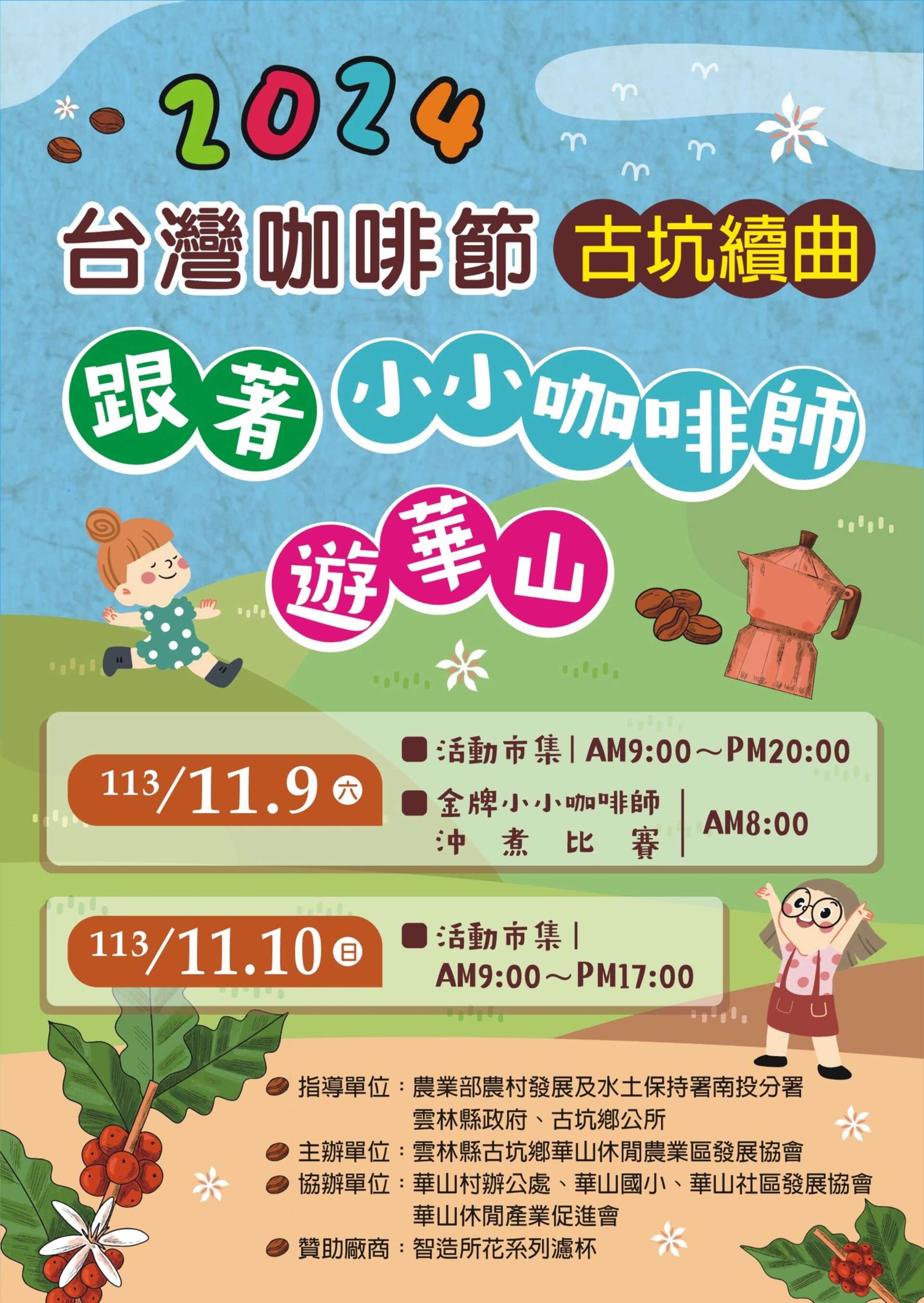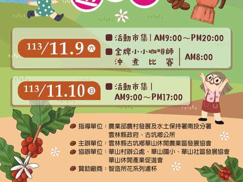 2024台灣咖啡古坑續曲|跟著小小咖啡師遊華山 小小咖啡師沖煮比賽,一起見證金牌誕生。 還有古坑在地農村特色產品、台灣精品咖啡、華山六寶。 活動地點 雲林縣古坑鄉華山國小 活動內容 113/11/09 活動市集 9:00-20:00