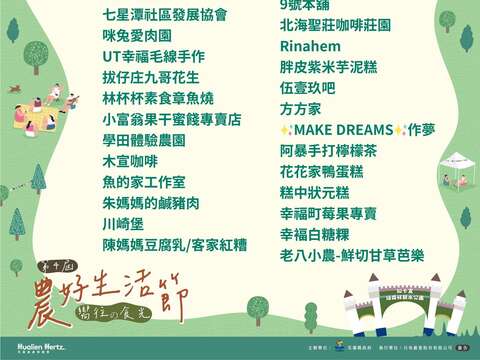 農好生活節超過40攤農村美食攤商、特色農特產品、農創品、手工藝品、文創商品的商家,等你來逛。