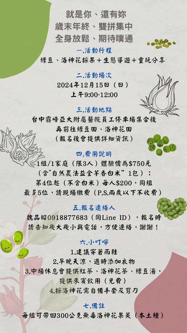 在火紅的洛神花田中,親手採摘一顆顆飽滿的花果,感受冬季的浪漫與自然的魅力;同時挑戰綠豆採摘的趣味任務,從田間撿拾綠色寶藏,了解種植背後的生態故事。不僅能享受田野間的悠閒時光,還能帶回自己親手採摘的果實,為這個冬季增添豐收的感動!