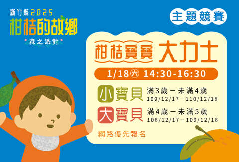 分組進行競賽,限時三分鐘拿取柑桔回到原點,看看哪位寶寶拿回終點的柑桔數量最多即獲勝。每梯次取前三名優勝者。