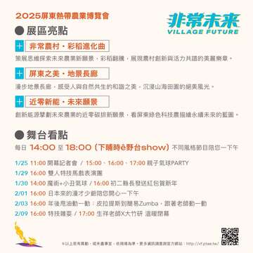 本次展覽共有五個展區,包含探索彩稻翻騰的農村活力、屏東地景的豐饒美景、近零碳排的農業科技、屏東四季百花百果的豐盈美感,以及好食好物展現的創新永續理念,共譜農業與自然和諧發展的美麗篇章。