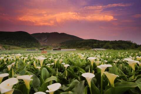 竹子湖位於陽明山國家公園海拔約670公尺,在層層山巒疊翠的包覆下保有豐富的生態,是臺灣少數適宜海芋生長的自然環境。花期自每年1-5月,花量最盛期在3-4月,雪白海芋花就會漫布田野;5-6月迎來大片繽紛的繡球花接力綻放,翠綠山谷變成一片蔚藍色的花之海洋。