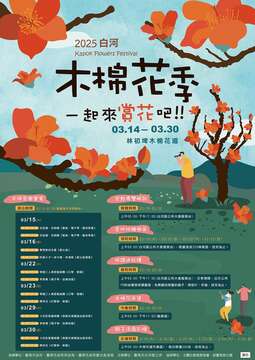 今年受寒冬氣候影響,花期延後,為了讓大家看到最美的木棉花道,原訂於3/1-3/16期間辦理114年木棉花季系列活動,延後至3/14-3/30(日),以提昇民眾來白河賞花的品質。