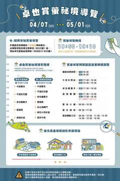 - 賞螢時禁止使用閃光燈、手電筒,避免干擾螢火蟲與其他遊客