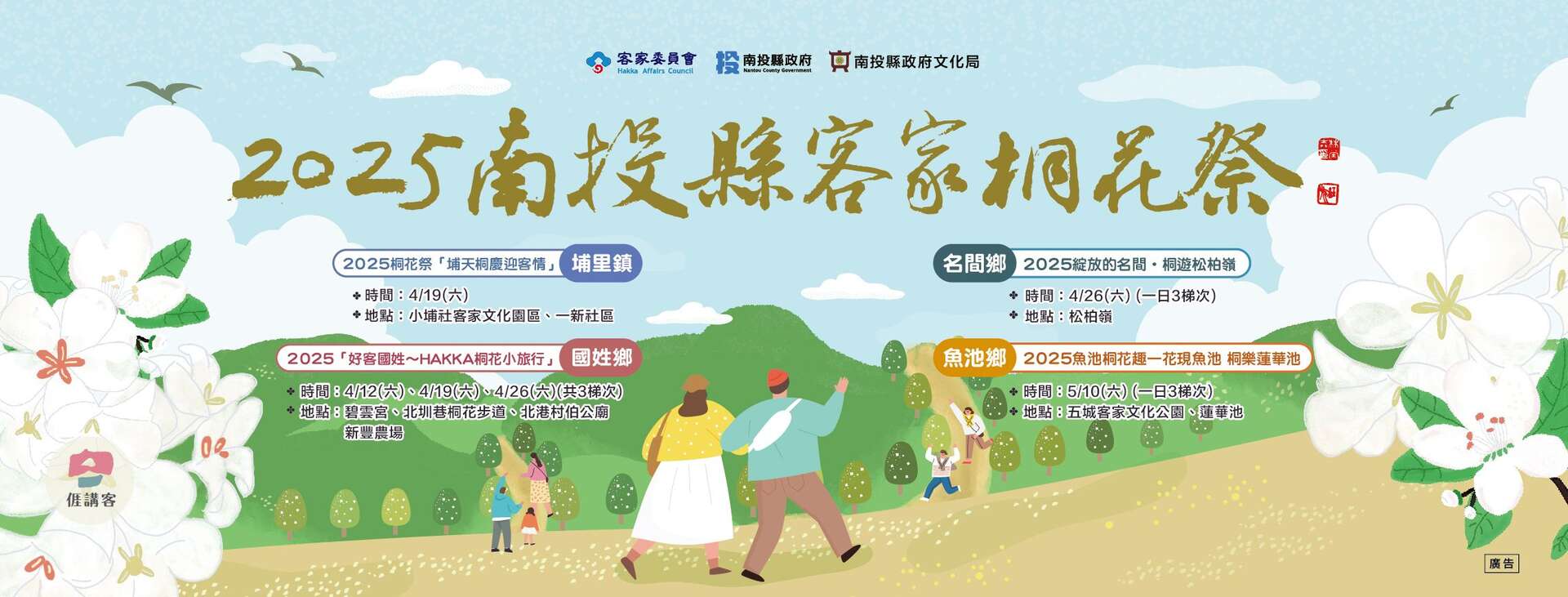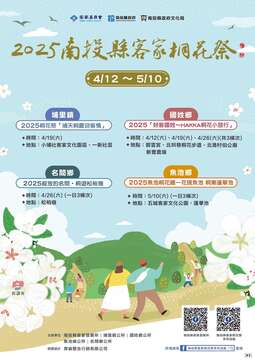 活動於4月12日至5月10日陸續舉辦,來到南投除了體驗豐富的自然生態、品嚐客家特色美食,還能探訪客庄及桐花景點,瞭解南投客家,享受南投好客風情,歡迎全國民眾「桐享客趣・花現投客」!
