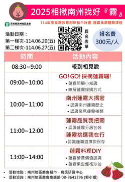 ※活動細節請洽主辦單位,農業易遊網僅供資料蒐集與整理;活動可能因颱風、豪雨特報等臨時狀況延期或取消。