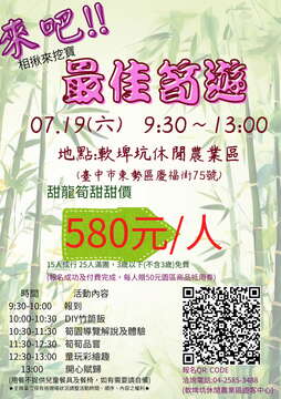 活動時間 7/19(六) 9:30-13:00 活動地點 臺中市東勢區慶福街75號(軟埤坑休閒農業區遊客中心) 活動流程 9:30-10:00 報到 10:00-10:30 DIY竹筒飯 10:30-11:30 筍園導覽解說及體驗 11:30-12:30 筍筍品嚐 12:30-13:00 童玩彩繪趣 13:00 開心賦歸 👉報名連結