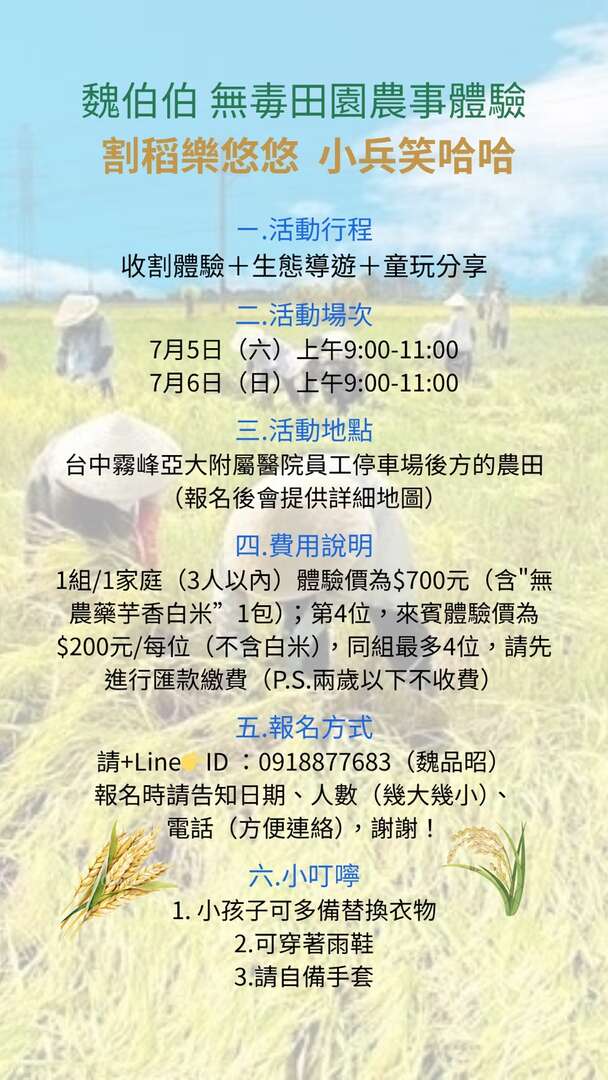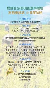 快帶小朋友來變身「小小農夫」,自己割稻、捆稻、跑田野,還能體驗魏伯伯童玩分享~一起往稻田出發囉!整場活動充滿笑聲、汗水和歡樂,讓孩子體驗不一樣的夏日冒險!