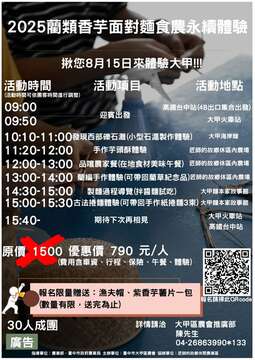 活動日期:8/15(五)早上9:00-16:00 報到時間:9:00--高鐵台中站、9:50--大甲火車站 活動地點:大甲海岸線、匠師的故鄉休閒農業區、大甲麵本家 報名費用:一人790元(車資、行程、保險、午餐、體驗) 報名限量贈送--漁夫帽、紫香芋薯片(數量有限,送完為止) 👉報名連結