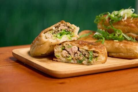 ◎蔥抓肉餅-以三星蔥抓餅包入滿滿的三星蔥及肉餡,小火慢煎,外皮酥脆肉餡多汁。