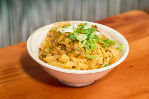 ◎蔥香拌麵-現揉麵糰加入蔥粉,自製麵條Q彈勁道,拌入蔥醬,每一口都吃得到三星蔥。