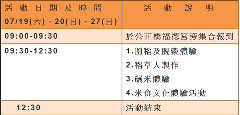 ※活動提醒: 1.活動現場無停車位,請搭乘捷運前往,淡水線忠義捷運站2號出口,步行8分鐘。 2.配合環保與限塑政策,本次活動請參加人員攜帶環保碗筷、水壺及毛巾。 3.避免水田泥濘,請穿著雨鞋為佳 4.每組材料有1隻稻草人製作用之竹竿及麻繩(裝飾用衣服、道具要自備)、3份米食料理體驗券、2斤碾米體驗用稻穀 以上活動內容取自:臺北市政府產業發展局FB、2025北投割稻趣活動說明