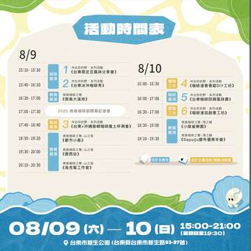 臺東縣政府以競賽、市集、工作坊等系列活動推廣台東咖啡品牌,市集活動邀請國際及國內咖啡各領域品牌現場展售,能一次品嚐台東南迴、縱谷或東海岸好咖啡,更涵蓋咖啡評鑑得獎豆交流分享會、講座體驗和表演等有趣內容,歡迎來自各地的大人小孩參與,由外而內沈浸式體驗南島咖啡風格慶典。