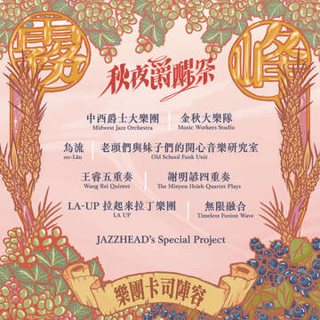 演出陣容|謝明諺四重奏、JAZZHEAD’s Special Project、烏流oo-Lâu、無限融合、金秋大樂隊、王睿五重奏、LA-UP拉起來拉丁樂團、老頭們與妹子們的開心音樂研究室、中西爵士大樂團