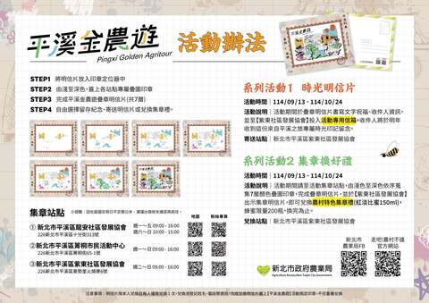 ※本活動限本人兌換且每人僅限兌換1次,兌換須登記姓名、電話等資訊,完成兌換明信片蓋上【平溪金農遊】活動限定印章,不可重複兌換