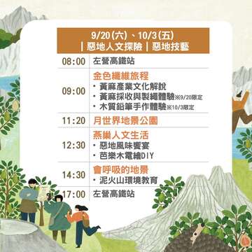 今年推出全新「惡地人文探險」遊程2大路線,帶大家走進這片神秘壯麗的自然舞台。從火鶴花園到社區巷弄,從宋江陣到泥火山,一路串起文化、產業與美食的精彩旅程。