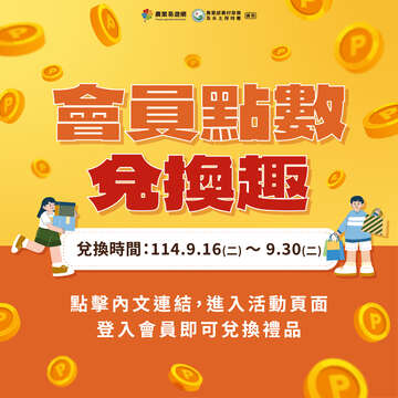 配合會員點數積點及會員等級辦法修訂活動,於114年9月16日至114年9月30日,辦理「會員點數兌換獎品-第一檔次」行銷活動,推出精選農遊伴手、農遊行程電子票券等獎品兌換,供農業易遊網會員進行點數兌換使用。
