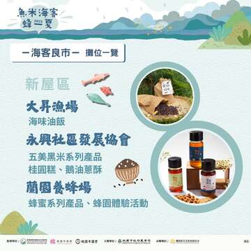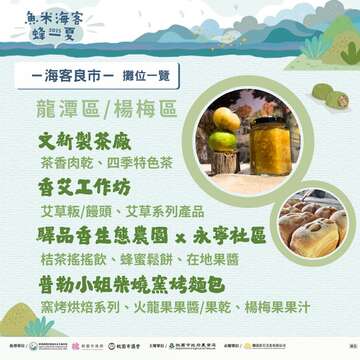 這次市集的攤位滿滿都是在地風味好物,來自桃園新屋、龍潭、楊梅還有大園~除了新鮮農產品,還有客家特色艾草粄與饅頭、天然蜂蜜系列;手工烘焙點心與當季水果果醬、果乾飲品;更有黑米產品與鵝油蔥酥等特色好物。現場還能體驗彩色香料鹽、防蚊液DIY,邊逛邊玩超有趣!