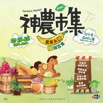 另為推廣屏東在地優質農特產品,強化農產品牌能見度,屏東縣政府將於 9 月 27 日至 28 日假高雄凹子底森林公園舉辦「屏東好禮在神農」市集活動。本次活動集結15攤以上屏東特色農產品展售攤位,並搭配精采舞台演出,展現屏東農業專業並結合神農市集,打造秋日限定的農產盛會。